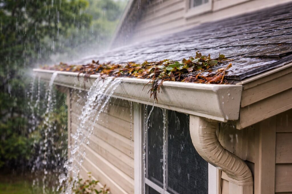 Leaves, twigs, and debris can block gutters, causing water to overflow during heavy rain. Instead of draining properly, water spills over the sides and flows down exterior walls.