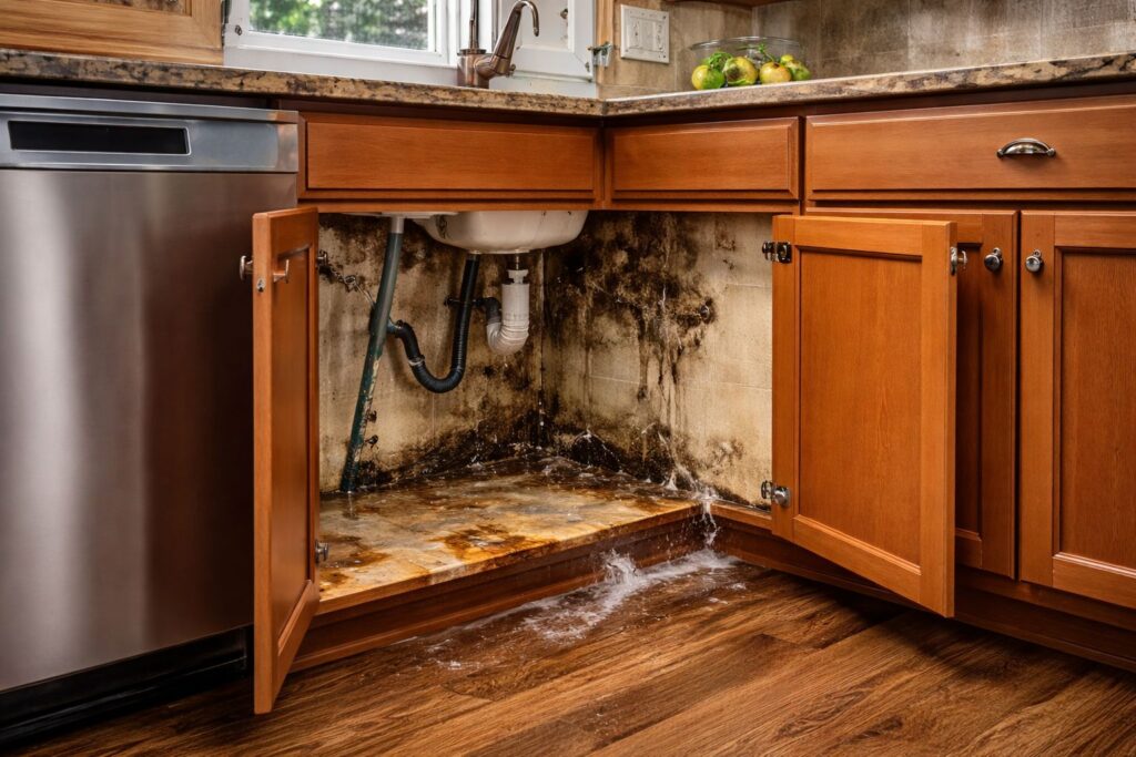 Water damage often appears first in kitchens because many cabinets are installed against exterior walls.