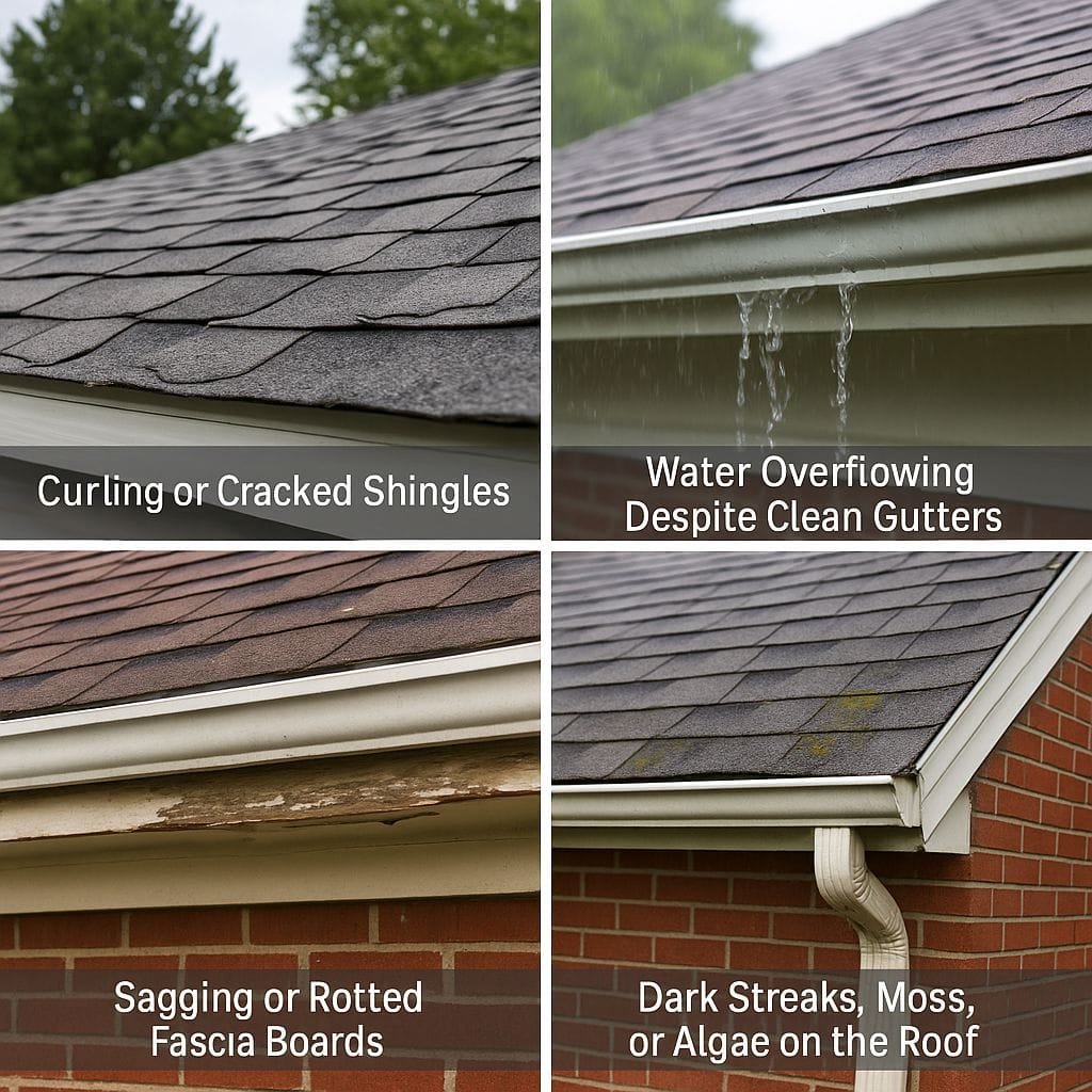 Our Midwest freeze–thaw cycles are brutal. When shingles start curling, cracking, or lifting, water can seep underneath and drip into your fascia — eventually warping or rusting your gutters.